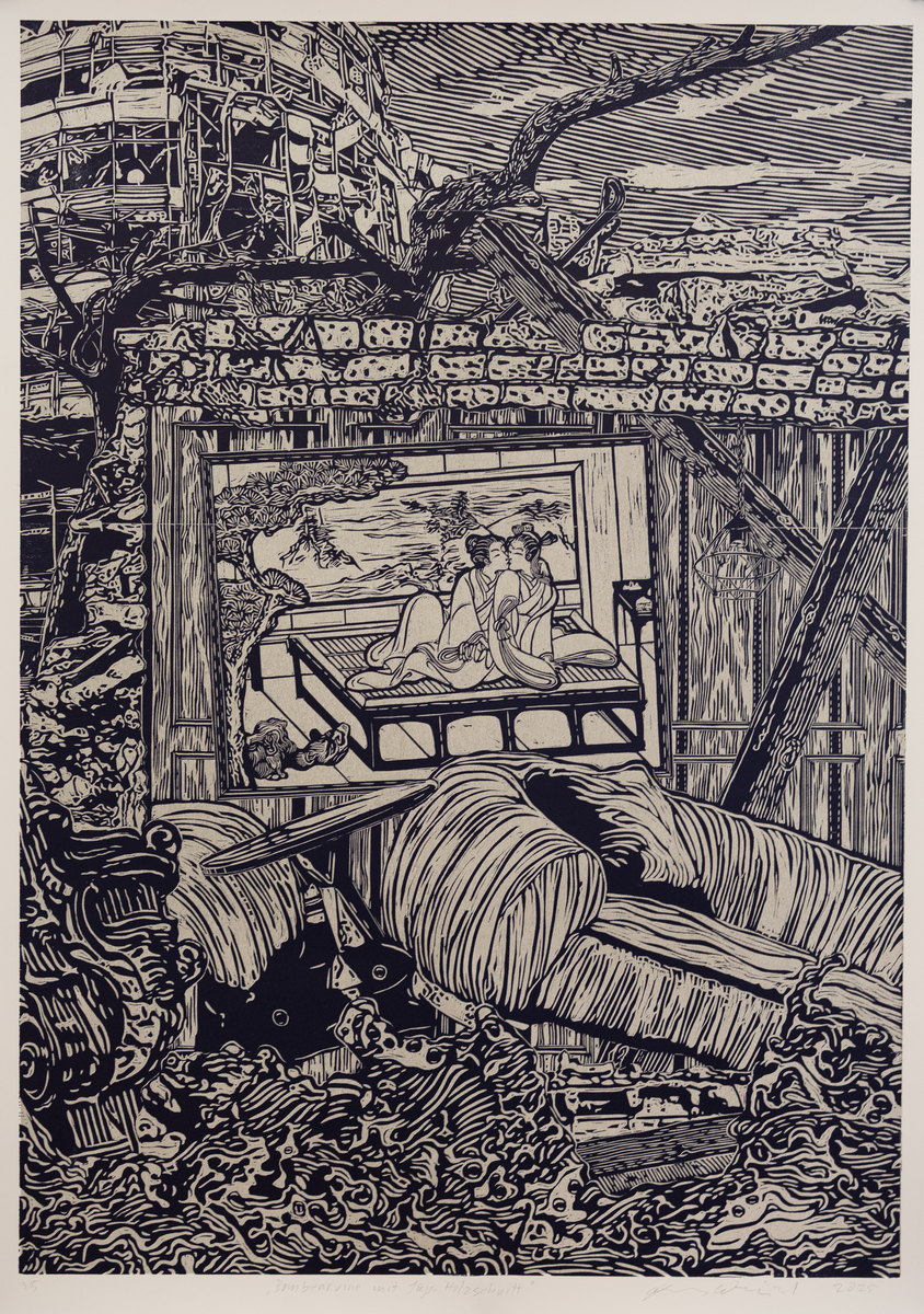 Bombenruine mit japanischem Holzschnitt (Abend), 2025